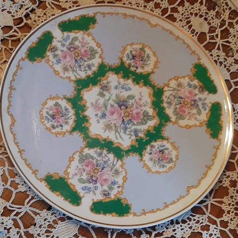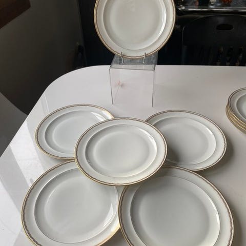 Middagstallerken fremstillet i Limonges med autentisk stempel på bagsiden. Blomstermotiv i midten. Kanter med guldfinish og blomsterdetaljer.