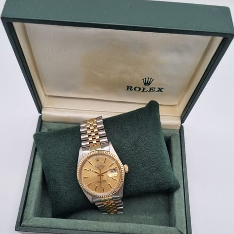 Rolex Datejust Turn-O-Graph 16250 til unisex, årgang 1982, automatisk uretsbevægelse, stålskcase på 36 mm, blå urskive, lang stålrem, original boks og papirer, i meget god stand med mindre brugsspor. Klik på den blå "gå til varen" knap, for at købe eller byde på denne vare. Den samlede pris vil blive vist inden du afgiver dit bud.