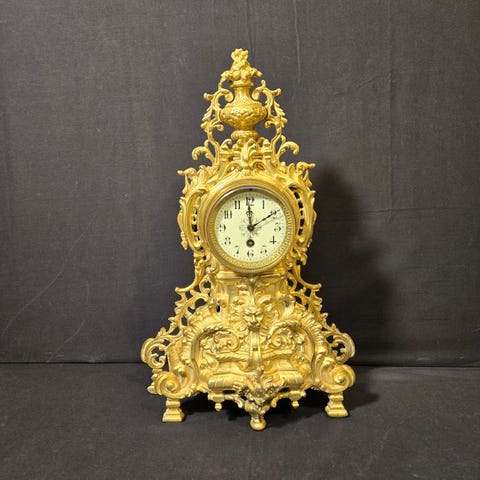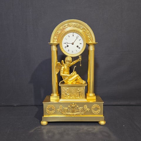 Smuk og elegant bronze topkvalitets fransk pendul i empire-stil. Klokken er fra omkring 1880-1900. Smukt design. Meget flot udført med træelementer, alt er i topkvalitet med smukke billeder. Tyk fransk kvalitet. Pendulen er 59 cm høj og 23 cm dyb, bredden er 38 cm. Denne pendul vejer 5,5 kilo. Topkvalitet. Klokken er i top stand for at være 140 år gammel.