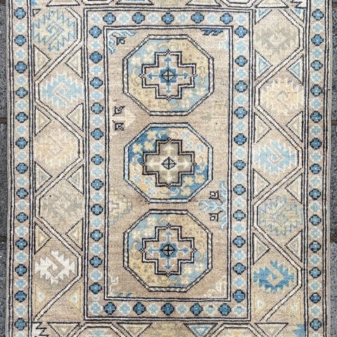 Til salg står et håndknyttet turkmensk tæppe fra Afghanistan i klassisk Bukhara-design. Mønstret viser regelmæssigt arrangerede Gül-motiver, der giver tæppet en rolig, afbalanceret og traditionel udstråling.