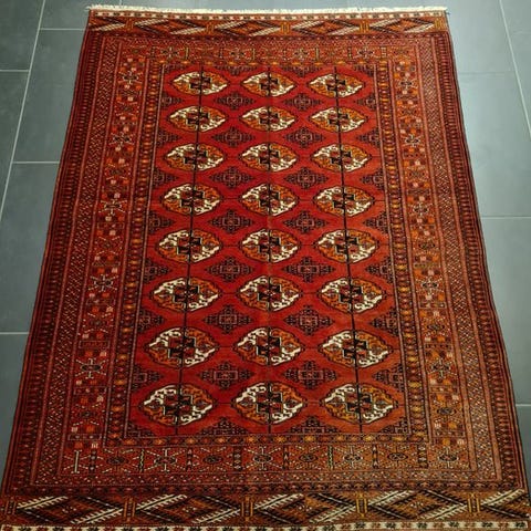 Turkmen-model håndvævet tæppe fra Afghanistan, måler 197 × 130 cm, uld på bomuld, i god Stand med alders- og brugsspor, dateret til slutningen af det 20. århundrede. Klik på den blå "gå til varen" knap, for at købe eller byde på denne vare. Den samlede pris vil blive vist inden du afgiver dit bud.