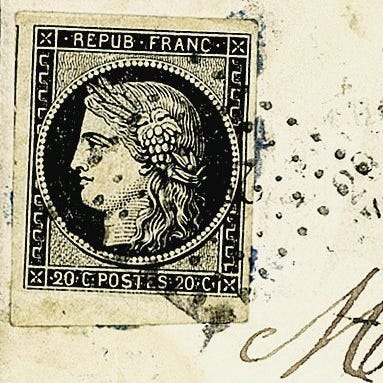 Frankrig 1850/1849 - Pragtfuld 20 centimes intens sort på hvidt med rød kursi...