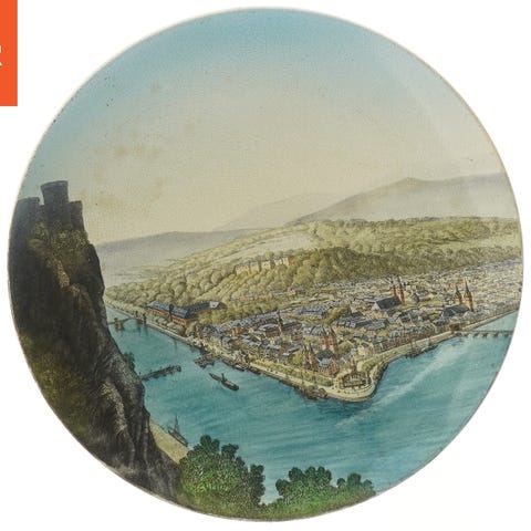 Til salg står en dekorativ porcelænsplade fra Villeroy & Boch fra den velkendte serie „Burgenland“. Pladen viser en gennemarbejdet landskabs-skildring med borganlæg, skibe og ornamentalt randdekor i klassisk blå og hvid.