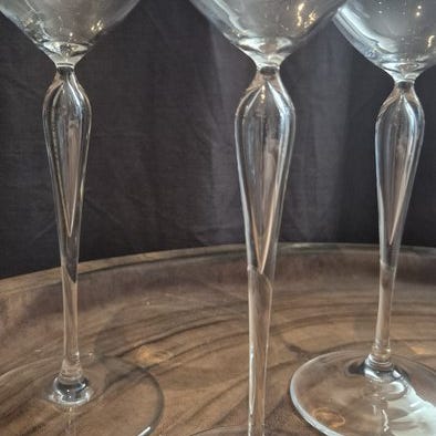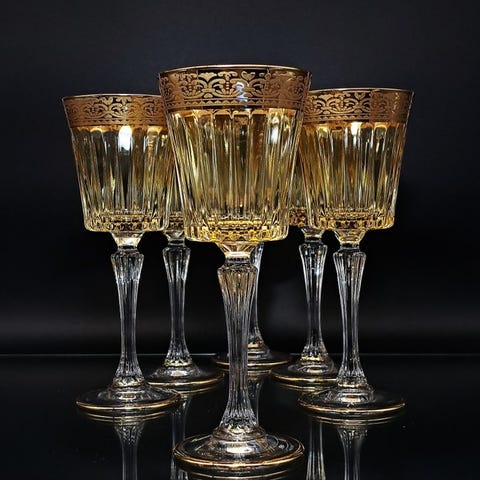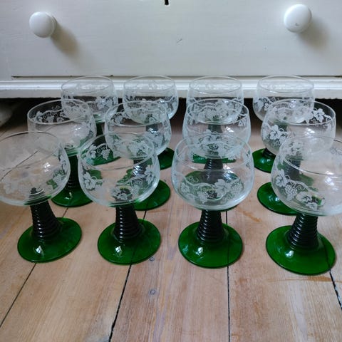 Glasene, Roemer-model med hexagonalt fod, skiller sig ud ved deres elegance og raffinerede design. Den solide vægt giver et behageligt greb, og deres glans samt gennemsigtighed lyser op i lyset. Højde: 20 cm.