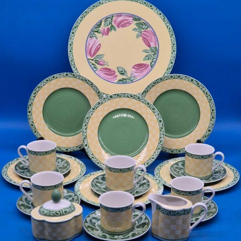 Til salg er et stilfuldt kaffestel fra Heinrich / Villeroy & Boch lavet af fineste Bone China i det elegante dekor 'Villa Medici'. Sættet imponerer med sin cremefarvede bund, det fine, omløbende ornamentbånd i grønne og guldnuancer samt den klassiske formgivning af alle elements. Alle dele bærer den originale bundmærkning og står for højeste porcelænskvalitet.