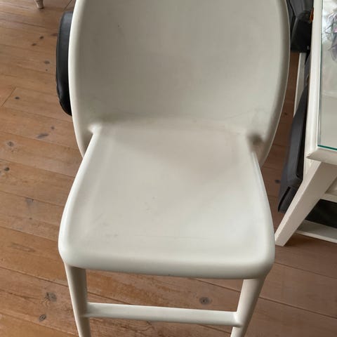 Stolen er i pæn stand, dog med mærker efter den har ramt bordkanten.