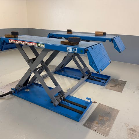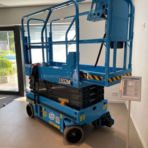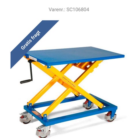 Translyft sakseliftbord i elektrisk udgave. Bordet har blå bordplade og orange saksekonstruktion med hydraulisk cylinder og el-motor. Styres via betjeningsboks med nødstop monteret på kabel. Velegnet til løft og håndtering af gods i værksted, lager eller produktion, hvor der er behov for stabil løfteplatform. Maksimal kapacitet og øvrige tekniske data fremgår af typeskiltet på liften.