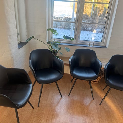 Tror den er fra Ilva. Spisebirdstoæ i sort kunstlæder. Stolen har polstret sæde og ryg med quiltet mønster på ryglænet samt integrerede armlæn. Slanke ben i mørk metal. Velegnet som spisebordsstol eller kontorstol i hjemmet.