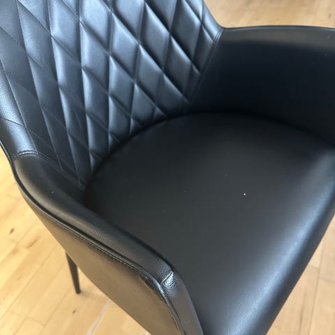 Sælger 6 stk. Marco spisebordsstole i sort kunstlæder med armlæn og sorte metalben.