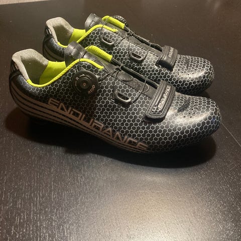 Endurance cykelsko i størrelse 39. Skoene er sorte med gule detaljer og reflekselementer bagpå. De har drejespænde og velcrolukning på overdelen for justerbar pasform. Undersiden er udstyret med klamper til racercykelpedaler (3-bolts system). Passer til de fleste cykler.