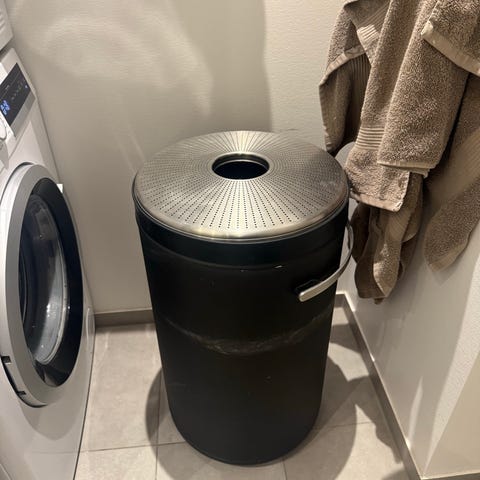 Vasketøjskurv med inder pose der er delt i to. Har fire hjul så den er let at flytte og den indvendig pose kan let tages op og sættes på plads igen.