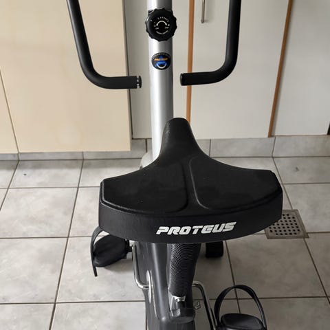 Proteus motionscykel i sort/grå. Cyklen har justerbart sæde og styr samt indbygget computer med display og betjeningsknapper på styret. Egnet til indendørs træning af kondition og udholdenhed. Velegnet til brug i hjemmet, f.eks. i garage, kælder eller træningsrum.
