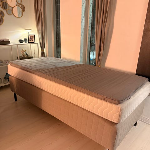 IKEA seng med ryglæn og sengehest i blå polstret udførelse. Sengen har lamelbund og står på slanke ben. Velegnet som enkeltseng eller daybed i soveværelse, gæsteværelse eller børneværelse. Madrassen på billederne er en skummadras med aftageligt betræk. Sengen placeres op mod hjørne, så ryglæn og side fungerer som støtte ved siddende brug. Ryglænet kan flyttes så det er i den anden side. Fremstår flot. Madrassen medfølger og er i rigtig god stand, da den kun har været brugt med topmadras . Man må også få topmadrassen med, den er dog noget ældre. Fra røg- og dyrefrit hjem. 90*200 cm.