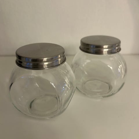 Glas og flasker med sølvfarvet låg