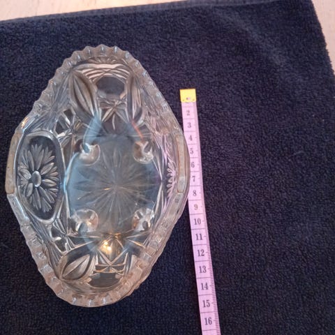 Glas skål i klart glas med facetslebet/lignende mønster hele vejen rundt. Skålen er rund og måler ca. 12 cm i diameter (jf. målebånd på billederne). Egnet til fx servering af snacks, slik eller som dekorationsskål. Står på små glasfødder, som løfter skålen en smule fra underlaget.