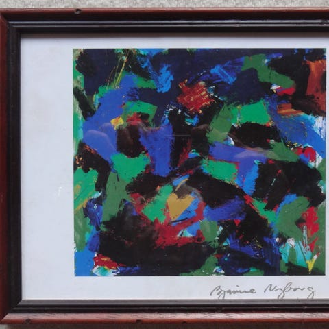 Abstrakt maleri i overvejende blå nuancer med orange og mørke kontraster. Billedet er monteret i en hvid ramme og har et udtryksfuldt, ekspressivt penselstrøg. Egnet som vægdekoration i stue, kontor eller andre opholdsrum, hvor der ønskes et farverigt kunstnerisk udtryk.