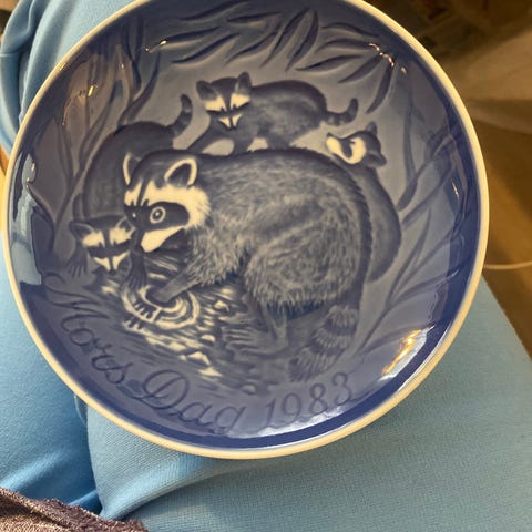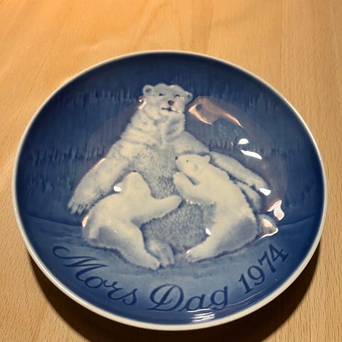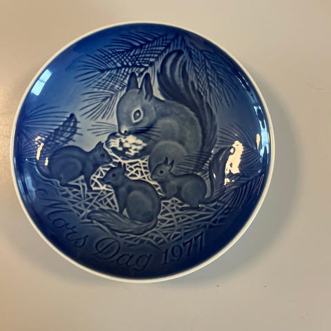 Bing & Grøndahl Mors Dag tallerkener i porcelæn med blå dekoration. Motiverne omfatter blandt andet rådyr med kid (1975), svane med unger (1976) og spætte med unger (1980). Tallerkenerne har ophængshuller på bagsiden og er mærket med Bing & Grøndahls stempel samt årstal og teksten "Mother’s Day". Velegnet som samlerobjekter eller vægdekoration.