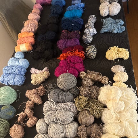 Garn i flere farver, herunder blå, sennepsgul, grøn og mint. Garnet fremstår som tykt og løst spundet, velegnet til projekter som tæpper og puder. Sælges samlet. Der er i alt 1200 gram.
