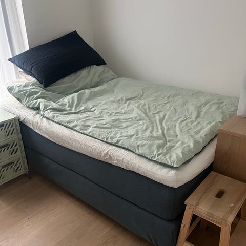 Ramme, springmadras og topmadras med latex på den ene side medfølger.