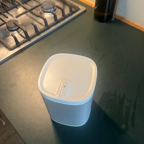 Sonos Play:1 trådløs højttaler i hvid. Kompakt netværkshøjttaler til brug i Sonos-multiroom systemer. Afspiller musik via hjemmenetværk og understøtter trådløs streaming, når den er tilsluttet strøm og netværk (kræver kompatibel Sonos-opsætning og app). Fysiske knapper på toppen til afspil/pause samt volumen op og ned. Velegnet til brug i stue, køkken eller andre rum som del af et Sonos-setup.