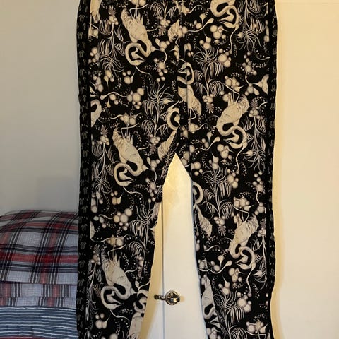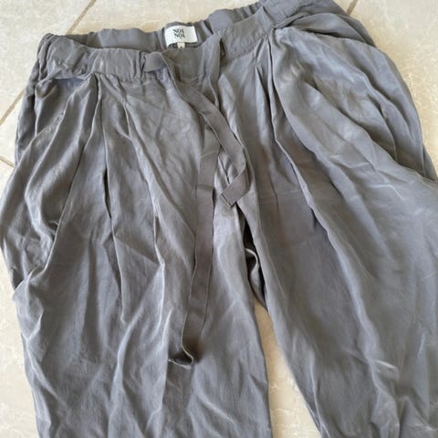 Lækre, bløde bukser fra Noa Noa. Materialet er rayon og polyester. Der er løbegang og snor i taljen. Lommer i siden og elastik ved foden. De måler 94 cm fra linning til fod og 67 cm fra skridt til fod.