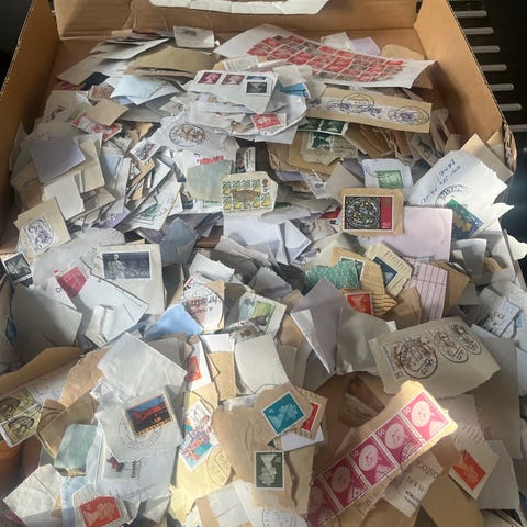 Blandet parti frimærker og frimærkeudklip i poser sorteret efter land.