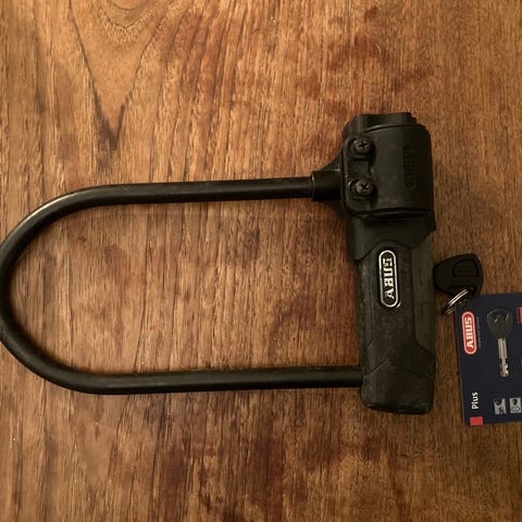 Abus bøjlelås til cykel i sort. Låsen er en kraftig U-lås med aftagelig bøjle. Den måler ca. 30 cm i længden, hvilket giver plads til at låse cykelramme og eventuelt hjul fast til fastmonterede genstande. Låsen leveres med nøgler, som ses på billederne. Velegnet til sikring af cykler eller andre genstande, der kan låses med en bøjlelås.