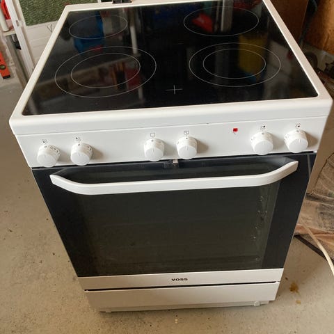 Voss komfur glaskeramiske med 4 kogezone med lys i knapperne varmluft ovn med selvrens magasin skuffe sokkel højde kan justeres fra 85 til 92 cm med kabel så det er klar til at tilslutte pæn og velholdt