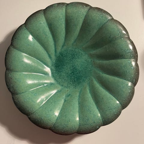 West Germany kvadratisk fad i turkis keramik. Fadet har reliefmønster langs kanten og en glat midterflade. Bagsiden er mærket med "W. Germany" og formnummer. Velegnet som serveringsfad eller dekoration. Der kan forekomme mindre brugsspor og en synlig revne ved et hjørne, som vist på billederne.