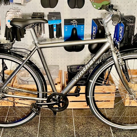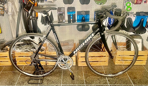 Nyistandsat: Ny krank, nyt kranksæt, ny kæde, nyt gearhjul, nye dæk og slanger, ny sadel, nye pedaler, ny støttefod, nye håndtag, nye skærme, nye bremsekabler og gearkabel, og ny ringeklokke.