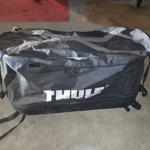 Thule rejsetaske i sort. Tasken har stort hovedrum med lynlås , til at spænde på et cykelstativ bag på bilen