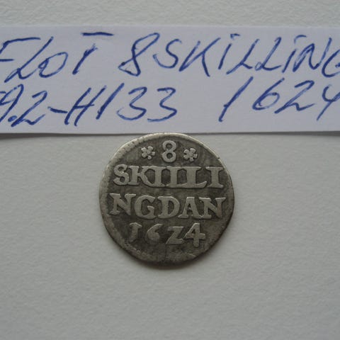 1 Skilling 1677, Hede 75A, Sieg 4. Ret sjældent årstal. Stempelfejl på bagsiden.