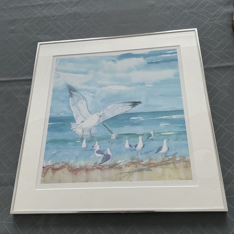 Landskabsmotiv billede med kyst og klitter. Motivet viser en strand med hav, klitter og dramatisk himmel. Billedet er indrammet med passepartout og glas, klar til ophængning på væg. Velegnet som vægdekoration i stue, gang eller kontor.