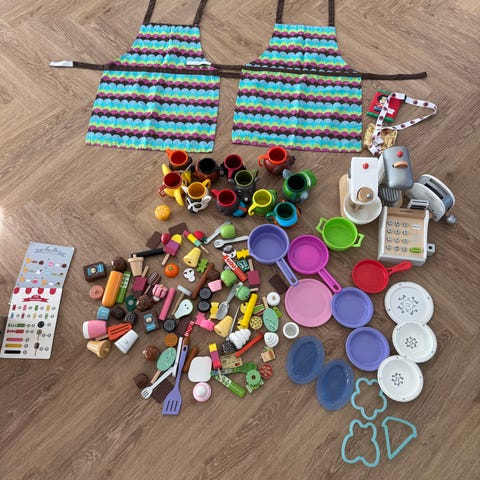 Dette legekøkkensæt indeholder en række plastikmadvarer, herunder pizza, hamburger, æg, grøntsager som gulerod og salat, diverse frugter som banan og appelsin, og drikkevarer som sodavandsflasker og vandflaske. Der medfølger også diverse køkkenredskaber som tallerkner, knive, gafler og en stegepande samt en orange indkøbskurv. Legekøkkensæt er ideelt til rollespil og kreativ leg for børn.