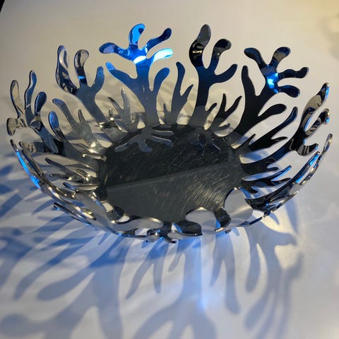 Alessi Mediterraneo skål i stål er en anderledes skål med flotte planteudskæringer, der slynger sig op af skålen hele vejen rundt.