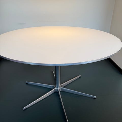 Fritz Hansen bord designet af Piet Hein og Arne Jacobsen. Rundt bord med hvid bordplade i laminat og aluminiumsbeklædt kant. Søjleformet base i stål med stjerneformet aluminiumsfod. Velegnet som spisebord eller mødebord i hjem eller kontor. Neutralt, lyst udtryk der passer ind i mange indretningsstile.