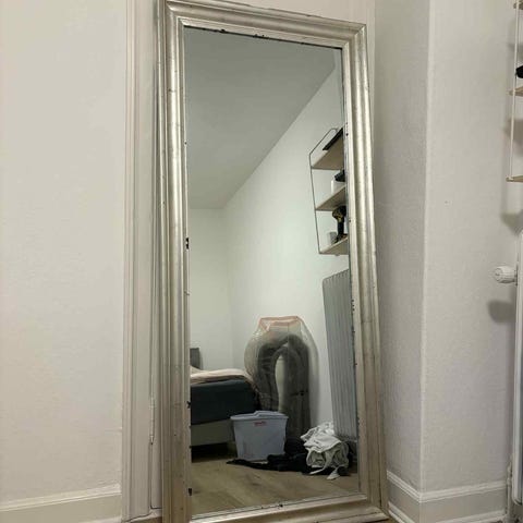 IKEA spejl med dekoreret ramme i sølvfarve. Rammen har et klassisk, ornamenteret mønster hele vejen rundt. Spejlet er stort og egner sig til brug som gulvspejl eller helkropsspejl i fx entre, soveværelse eller garderobe. Designet er neutralt og kan passe ind i forskellige indretningsstile.
