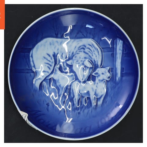 Porcelænstallerken med en diameter på 15 cm, der har en bemærkelsesværdig blå inderside med et dekorativt mønster. På ydersiden af tallerkenen står der trykt 'Mors Dag 1977', hvilket antyder, at det er en samlerobjekt eller en speciel udgave. Bagsiden af tallerkenen har et stempel, der viser 'B&G' og kan indikere, at det er en Bing & Grøndahl porcelænstallerken. Der er også en lille metaltråd bagpå, som gør det muligt at hænge tallerkenen som dekoration. Tags: porcelæn, samlerobjekt, dekoration, morsdag.