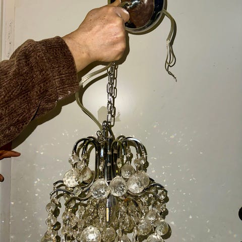 Del til en krystal lysekrone. Produktet inkluderer en cylindrisk sektion med flere krystaldetaljer, påført på en metalbase med tilslutninger, samt løse krystal stykker og skruer. Størrelse: 20x15 cm. Tags: krystal, lysekrone