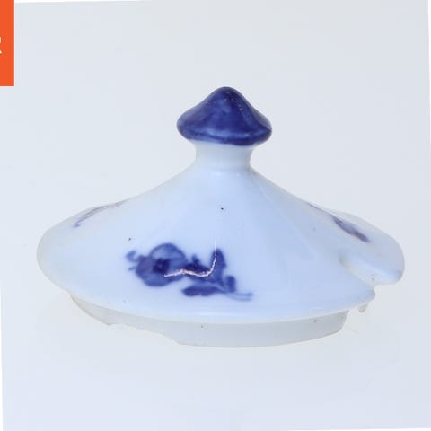 Royal Copenhagen blå blomst låg til terrin, modelnummer 10/8054. Låget har en længde på 23 cm og en bredde på 18 cm.