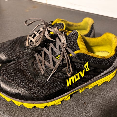 En af de bedste terrænsko, men desværre 0,5 nummer for lille til mine fødder. Skoen har været brugt til O-løb og har løbet 100-150 km i skov/grus, så der er stadig masser af km tilbage i dem.
