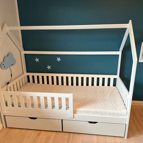 Sanders / Et hjem Fanny juniorseng 90x200, ydre mål 98x211, "Ben" højde 73,5, fremstår pæn, men lidt brugsspor, uden misfarvning, naturtale knopper på hjørnerne, dutter til skyer medfølger (ikke sat på) god meget velholdt / lidt brugt Träumeland madras kan tilkøbes for 400,- afhentes