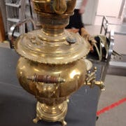 En messing kande med en aftagelig top. Håndtaget er i træ og viser tegn på brug med lidt afskrabninger. Bunden af kanden har tydelige mærker efter brug, og messingens overflade er lidt præget af patina. Kanden måler 22x25 cm.