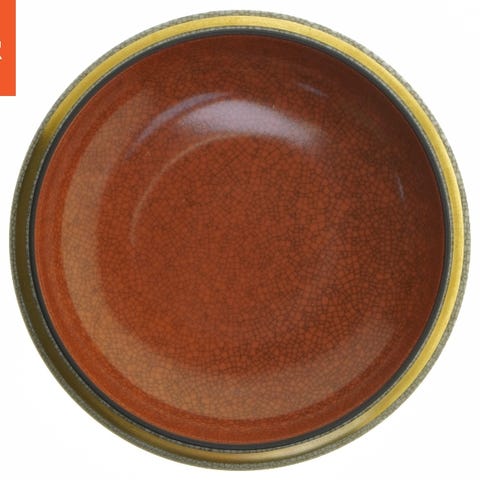 Keramikfad med en distinkt crackle glasur og en guldkant. Fadet har en rillet kant og et rustfarvet midterområde.