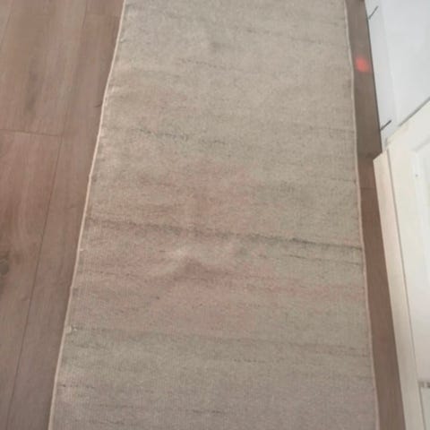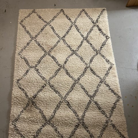 IKEA Aksfrytle tæppe i størrelsen 135x190 cm. Rektangulært tæppe i lys/hvid nuance med mørkt, geometrisk mønster. Egnet til brug i stue, soveværelse eller andre opholdsrum. Fremstillet som vævet tæppe med kort, blødt luv. Kan anvendes på de fleste typer gulve og under møbler som sofa eller spisebord, afhængigt af rummets størrelse.
