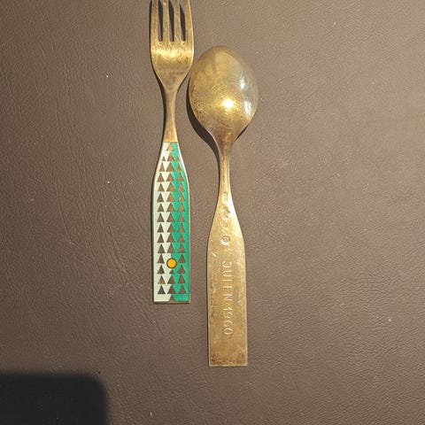 1977 Bestik sæt med gaffel og ske med emaljeret skjoldmotiv