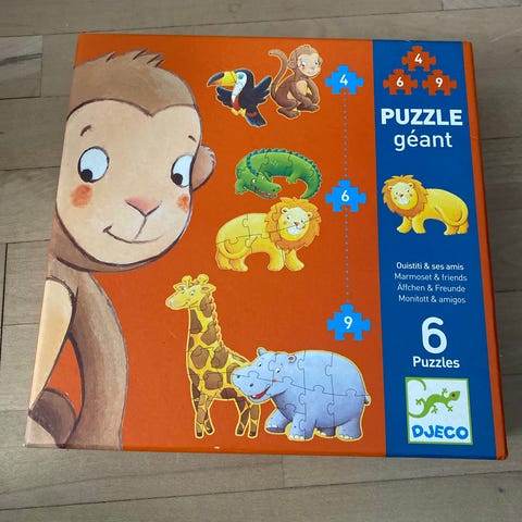 Djeco Jungleexpress puslespil til børn. Motivet viser et tog i junglen med dyr og planter. Puslespillet består af brikker, der samles til et kvadratisk billede. Velegnet til mindre børn, som kan øve finmotorik og billedgenkendelse ved at samle motivet.
