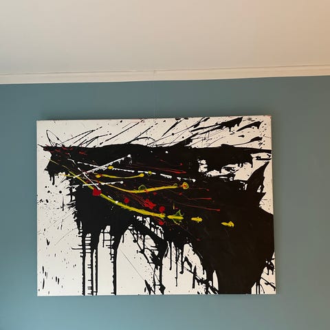 ALB maleri portræt af barn i gule og sorte nuancer. Maleriet viser et tæt udsnit af et barns ansigt med fokus på øjne, næse og mund. Motivet er udført i en kraftig, pastos penselstil med dominerende gule, hvide og sorte toner på mørk baggrund. Kunstnerens signatur "ALB" ses nederst på værket. Velegnet som vægdekoration i stue, gang eller kreative rum, hvor et markant og udtryksfuldt portræt ønskes.