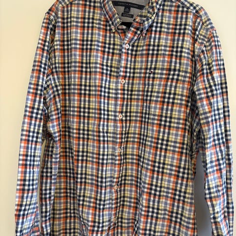 Tommy Hilfiger TH Flex herreskjorte i størrelse L. Skjorten er multifarvet med ternet mønster og er fremstillet i bomuld med stretch ( 96%bomuld +4%elastan.)Regular Fit stretch.