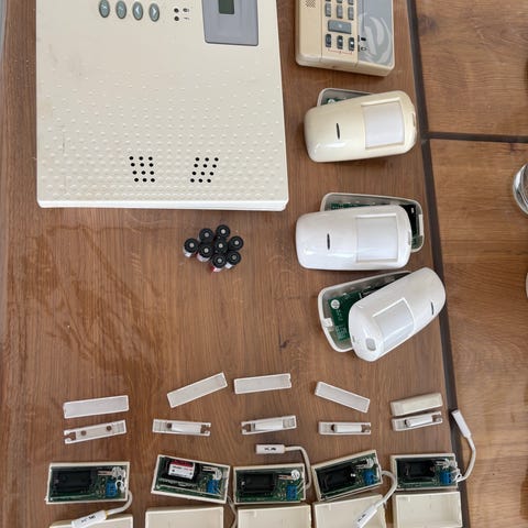 Trådløst alarmsystem i hvidt design. Sættet omfatter flere komponenter, herunder sensorer, en rund hovedenhed/kontrolenhed, vægmonteret enhed samt mindre tilbehørsdele. Systemet er egnet til overvågning og sikring af bolig eller mindre erhvervslokaler. Enhederne er beregnet til indendørs brug og er udført i hvid plast. Velegnet til brug som alarmsystem med bevægelses- og/eller dørsensorer afhængigt af den konkrete model og opsætning.